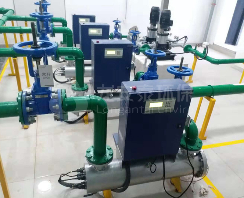 項目概述:天津某電廠利用垃圾燃燒的熱量發電。電廠共有兩臺發電機組,配備兩套循環水系統,循環水量分別為2000m3/h和4000m3/h,兩臺機組的凝汽器材質均為不銹鋼,空冷器、油冷器均為銅材質,配備龍安泰環保2套電化學設備及相關配套設施。經過長時間的穩定運行,循環水處理效果良好,阻垢、緩蝕效果顯著。循環水水質:循環水補水為污水廠中水,循環水系統結垢、腐蝕情況的控制難度大,綠藻滋生嚴重。循環水量:6